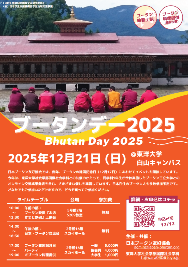 日本ブータン友好協会では、例年、ブータンナショナルデー(建国記念日12月17日)にあわせてイベントを開催しております。今年は、下記の内容で実施する運びとなりました。ご参加を希望される方は、下記【申込方法】をご参照の上、期日までに申込をお願いいたします。